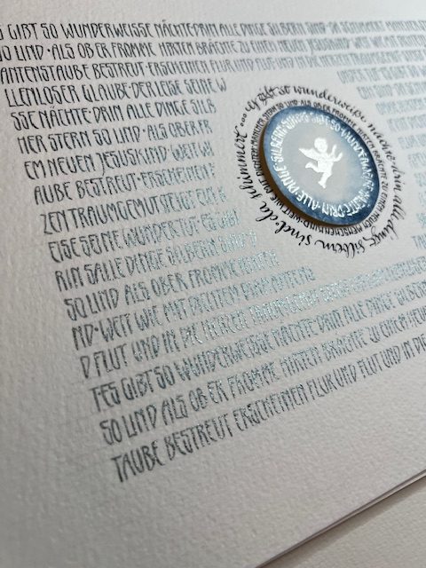 Jugendstilschrift mit Variationen, Layout, Textgestaltung und das Einbinden gestalterischer Elemente in die Texte – der eigenen Kreativität sind keine Grenzen gesetzt. In Verbindung z.B mit der Unziale ( Einführung für die Teilnehmer, die diese Schrift noch nicht kennen) entstehen kontrastreiche Blätter, welche dann in einer einfachen Bindung zusammengefaßt werden können- auch mit Übungsblättern!