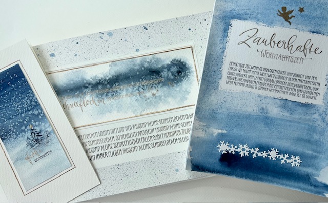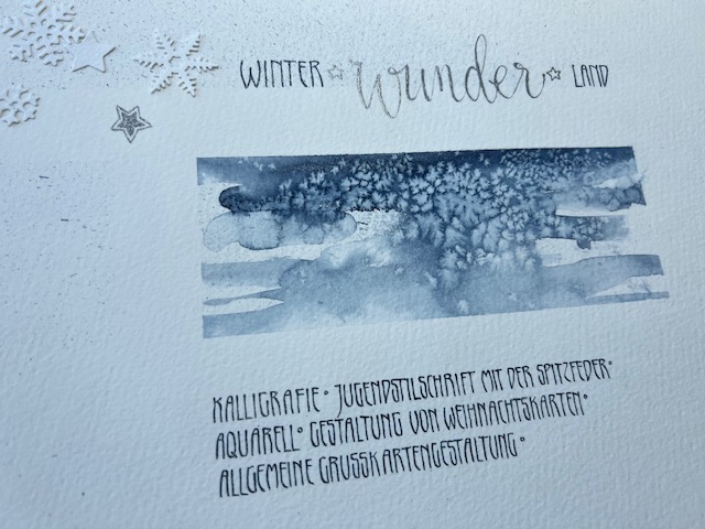 Wir begeben uns auch in diesem Kurs ins „Winter-Wunderland“ – gestalten Weihnachtskarten, Geschenkanhänger, Lesezeichen. Wir beginnen mit Schreibübungen der Jugendstilschrift und gestalten mit Aquarellfarben einfache Hintergründe. Aquarellmalen kann ich nicht/ noch nie gemacht… gibt es nicht! Schritt für Schritt gebe ich eine Anleitung zum Aquarellmalen: Wir erstellen eine Farbkarte, machen uns mit der Technik vertraut, entwickeln optisch schöne Kompositionen . Ich erkläre die unterschiedlichen Möglichkeiten des Aquarelierens und mit einfachen Mitteln gestalten wir z.B einen wunderschönen Winterwald. In Verbindung mit der Jugendstil-Spitzfederschrift (oder einern anderen Schrift Eurer Wahl) entstehen wunderschöne „Klassiker“ Wir stanzen, lassen es mit Embossing glitzern , prägen und falzen – es wird weihnachtlich…