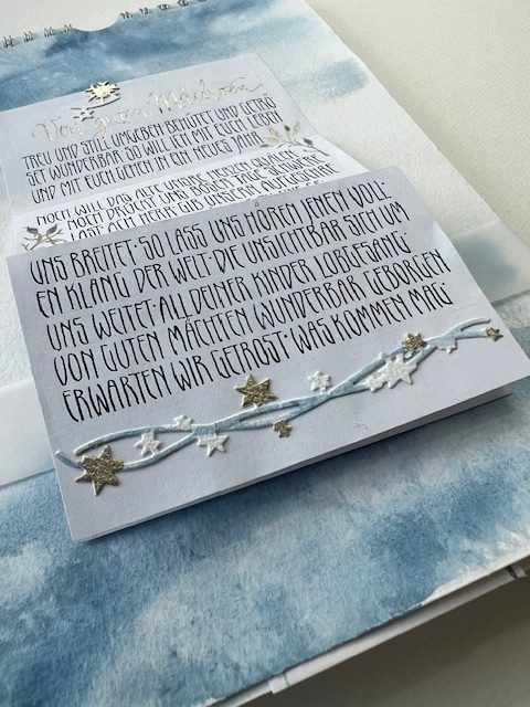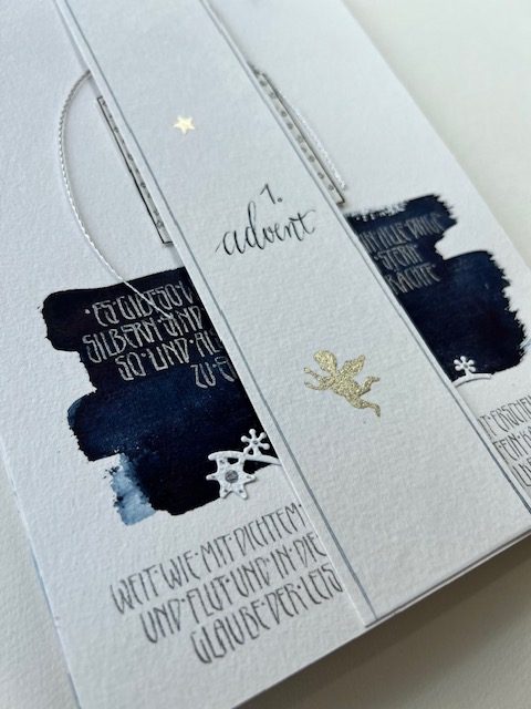 Wir gestalten Hintergründe in Aquarelltechnik, kombinieren kleine Geschenkideen und zusäzliche „kalligrafische Überraschungen“ in die Blattgestaltung mit ein und am Ende kann auf Wunsch ein Advents-Sonntagskalender – Größe A4 oder kleiner, z.B Postkartengröße) gebunden werden (Material für die Bindung vorhanden)